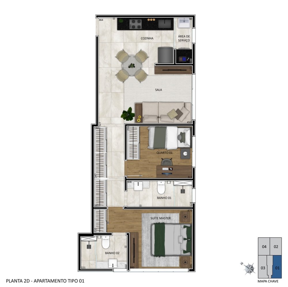 São três tipos de plantas para você escolher: apartamentos com 1 ou 2 quartos e suíte, cozinha integrada ou americana, sala ampliada e até banho social, para adaptar ao seu estilo de vida.