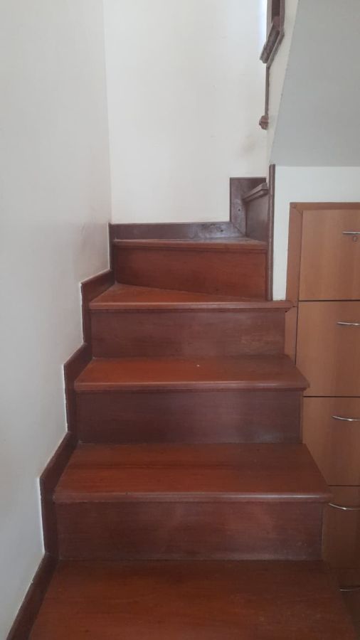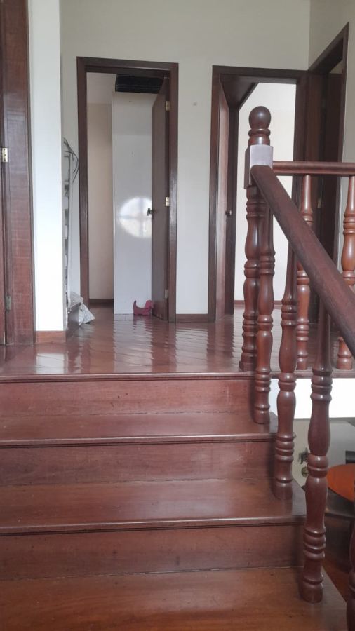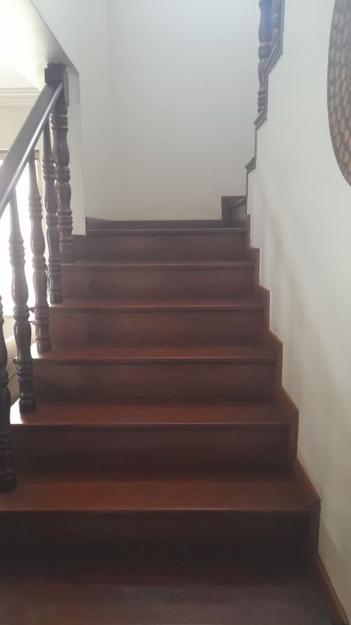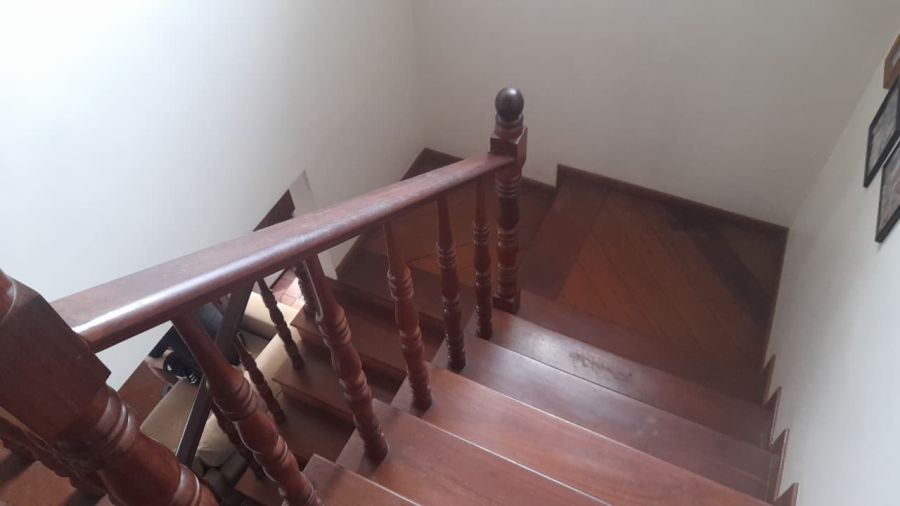 A escada de acesso entre os pavimentos é em madeira, agregando charme ao imóvel.