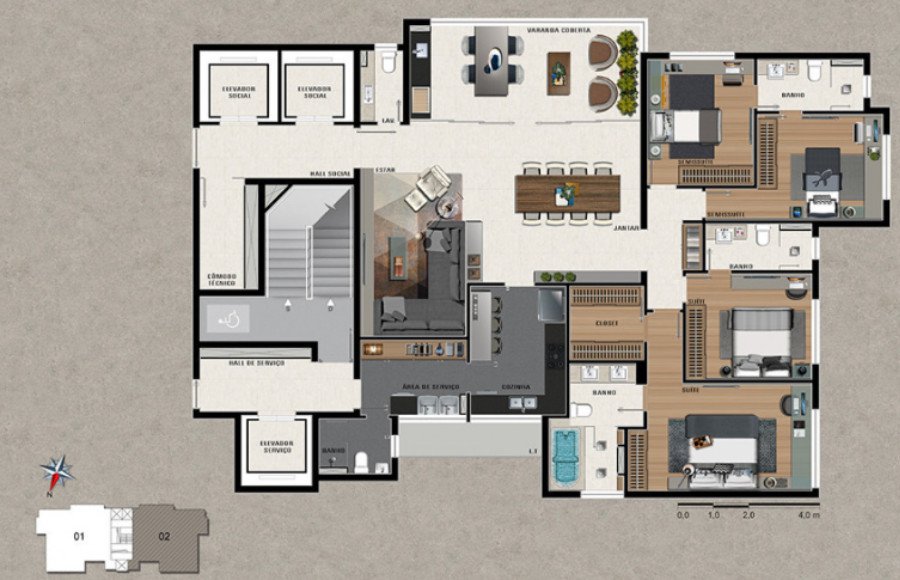 4 quartos, sendo 2 suítes e 2 semissuítes, com armários.