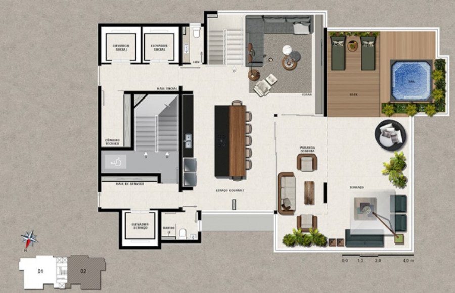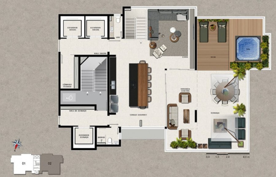 2 apartamentos de cobertura, com aproximadamente 346m² de área privativa, incluindo os terraços